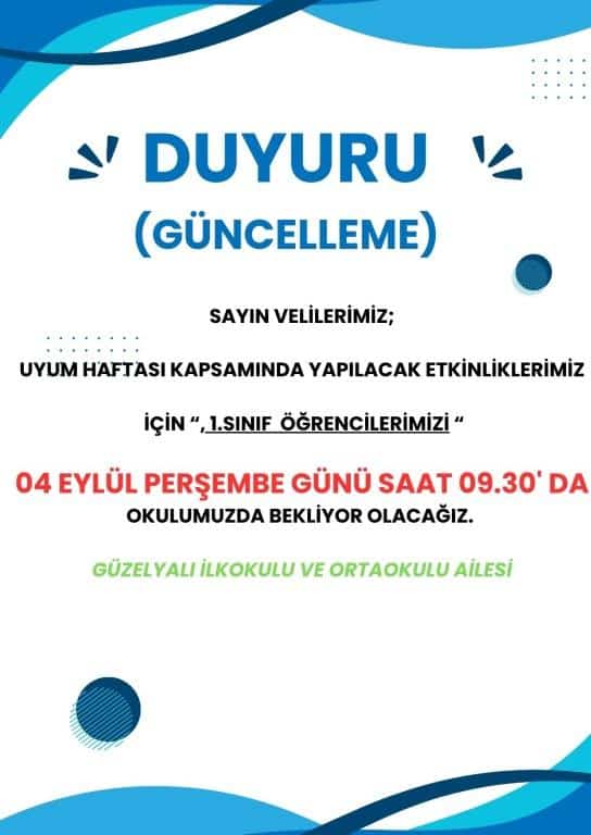 UYUM HAFTASI ETKİNLİK TARİHİMİZ GÖRSELDEKİ GİBİDİR. TÜM ANA SINIFI VE 1.SINIF ÖĞRENCİLERİMİZİ BEKLİYORUZ.